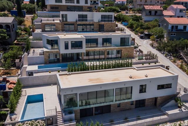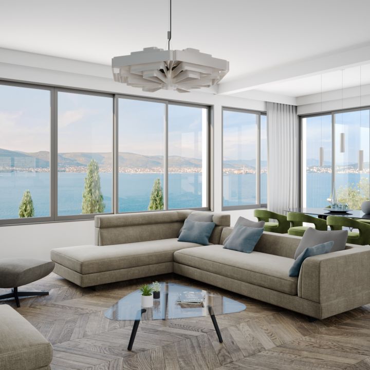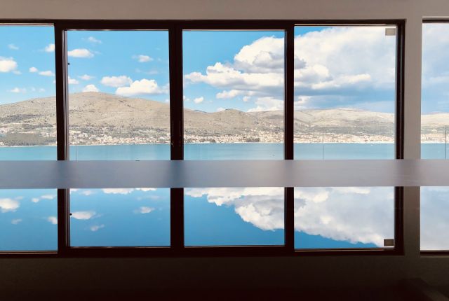 На основном этаже расположены 3 просторные спальни и 3 эксклюзивные ванные комнаты. Каждая из них выходит на нижнюю солнечную террасу. На втором этаже находится еще одна спальня и ванная, а также гостиная и столовая. Застекленная с обеих сторон и богато оформленная гостиная и столовая площадью 63 м2, включает в себе кухню открытого типа, что не оставляет желать ничего лучшего. Благодаря именно широким оконным профилям открывается чудесный вид на лазурное море. Сидя здесь и наслаждаясь прохладительным напитком можно наблюдать за проплывающими мимо роскошными яхтами.